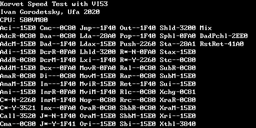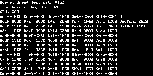 Не знаю, будет ли это кому-то интересно, но переделал под корвет тест быстродействия. Используется таймер и т.к. его частота и частота процессора не совпадают, то возможна небольшая погрешность в 1 такт таймера, но это ерунда. Цифры для каждой команды - это число тактов таймера, за которые выполнится 1000 команд. Перевод в такты процессора (при Fcpu=2.5 МГц) *5/4/1000. Для примера результаты из emu с 8080 и z80.