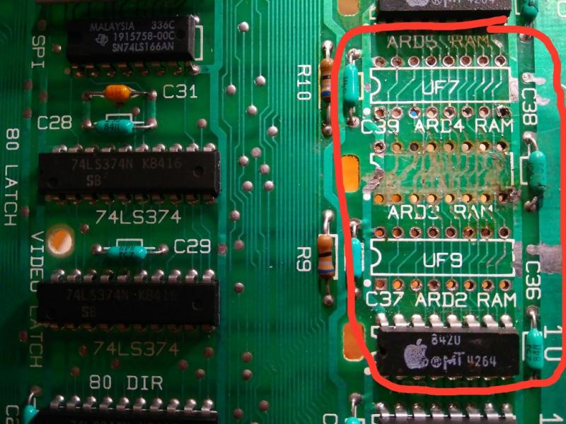 Вот фотка апгрейда ОЗУ на Commodore Pet 4008 до 32кб. В плате на фабрике были высверлены 4 отверстия, чтобы предотвратить этот самый апгрейд (ДБ!). Как уже говорили выше - дорожки ОЗУ легко восстанавливаются проволочками. Я использовал wiring pen - проволока с лаком, который слезает при температуре выше 350 градусов в местах нагрева. Очень удобно!