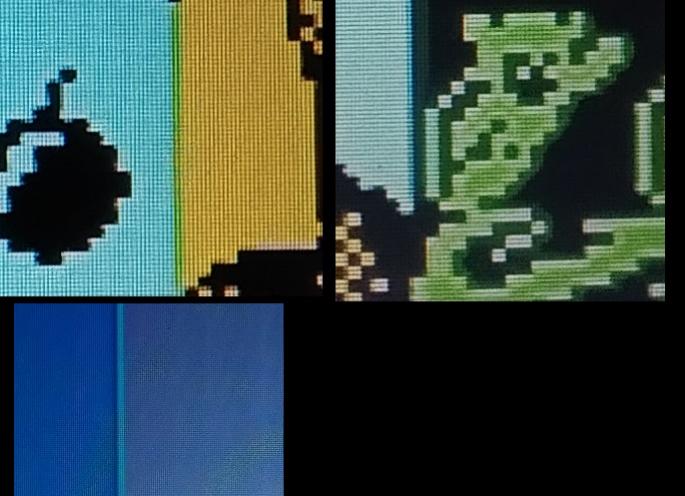 При переходе между голубым и желтым получается полоска зеленого. Зеленый на черном размазывается на несколько пикселей. Между синим и белым - голубая полоска....