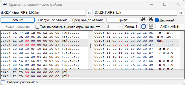 Длина бинарника Spc_FIRE.bin из первого сообщения - 4619 (0x120B) байт. Соответственно, конечный адрес 0x120A. Таким образом у меня в файле всё корректно. Но лишнее - это не недостающее. А вот отличия в районе 0x640, как выяснилось, были критичными.