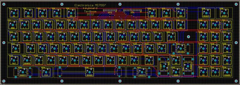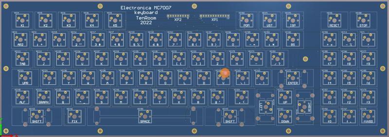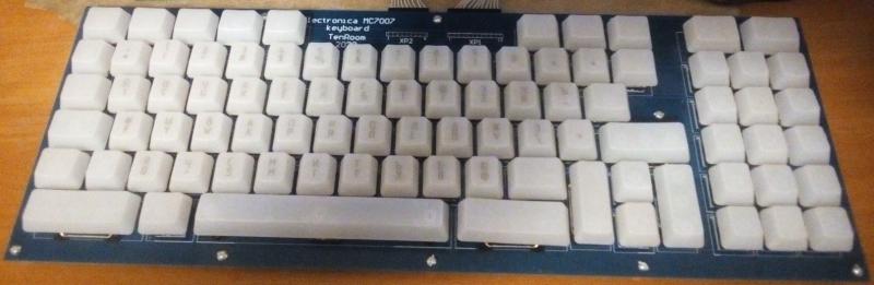 Реплика клавиатуры МС7007. Реплика по размерам и крепежу не является полной. Распиновка разъёмов соответствует оригиналу. Размер 400мм х 140мм. Использовал с компьютерами "Aleste-520" и "Орион-128". Дорожки к кнопкам подведены снизу - если нужно перерезать дорожки, не нужно выпаивать кнопки.
