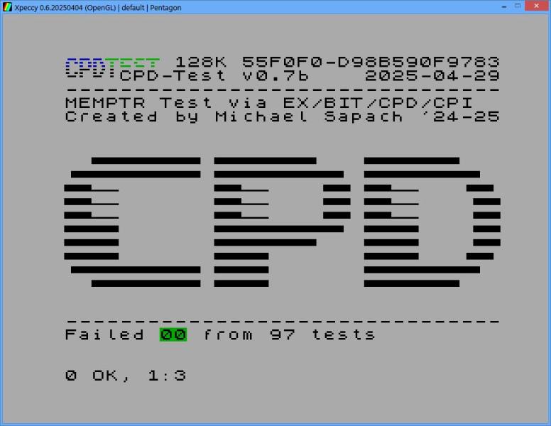Новая версия. Переделал тесты, много добавил, что-то объединил, что-то разъединил. Теперь проверяются все инструкции и вызовы прерываний, меняющие MEMPTR, кроме: инструкций RST, вызовов прерываний в режимах IM 0 и 1, разбитых инструкций CPIR и CPDR. Тесты разбитых OTIR и OTDR работают только на 128-х машинах. :ZXPlus: Для тех, кто будет проверять на реалах, сделал турбозагрузчик, чтобы быстрее все это дело грузилось. Сделал вывод некоторой идентификационной информации, в будущем буду пробовать на ее основе адаптировать тесты под конкретные модели процессоров, но нужна обратная инфа от вас: что на экране, какой установлен процессор. Проверьте, пожалуйста, на реальных машинах, у кого есть возможность. Спасибо.