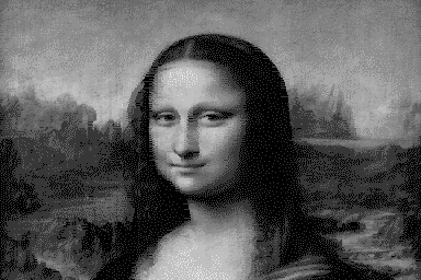 Данная картинка имеет стандартное разрешение 384*256, а каждые 8 горизонтальных пикселей имеют только две градации серого из 16-ти, то есть 4-х битная кодировка. 8 пикселей соответствуют одному байту цвета.