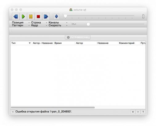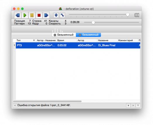 То же самое из Launchpad > zxtune-qt , запускается с Ошибка открытия файла '/-psn_0_340051'. Драгаем на него файл с рабочего стола di_blues.pt3 - ноль эмоций. Добавить файлы - открыло с пути /Users/user/Desktop/di_blues.pt3. Нажимаем играть. Играет. Но не di_blues.pt3 , а Defloration.mod который пытался открыть несколько запусков назад. Да, файл открылся в новой вкладке "Безымянный", в предыдущей вкладке "Безымянный" слева от нее появился Defloration.mod , активна вкладка c di_blues.pt3, но играет Defloration.mod