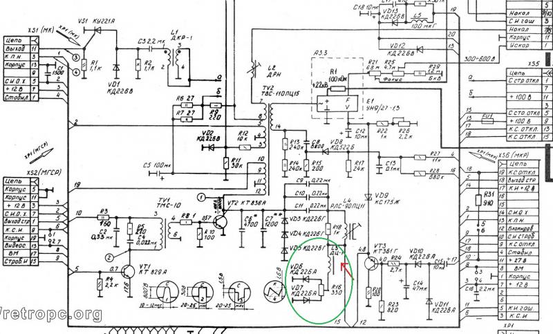 Попал ко мне на восстановление монитор 32ВТЦ202. После того, как я его разобрал, увидел что на плате блока разверток кто-то добрый не понятно когда и зачем выпаял 4 элемента: два диода, реостат, и катушку...