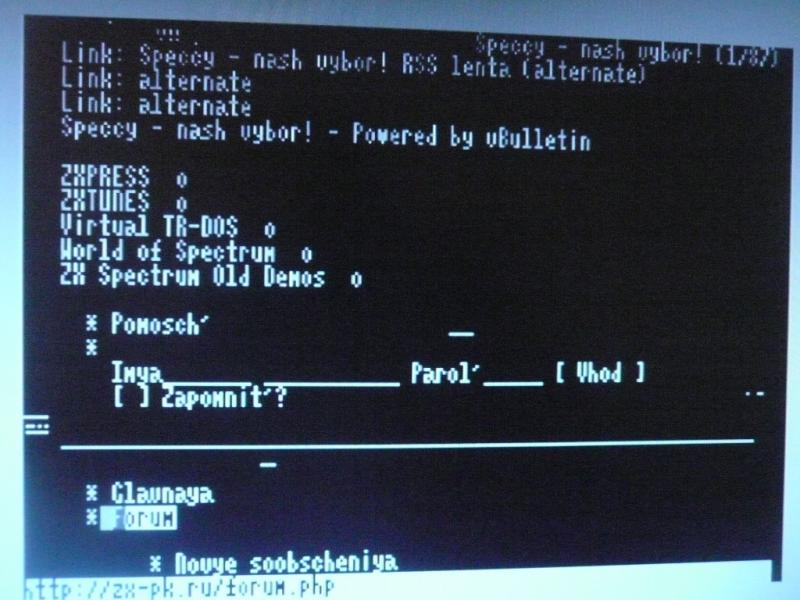 Да, согласен. Получается что здесь мы просто смотрим в терминал линукса глазами спека. Можно еще написать программу конвертер скрина веб-браузера на ПЦ в экран спектрума и так же отправлять в спек. С одной стороны самообман, с другой - как еще замутишь контактики, чятики и ютубы на спектруме.