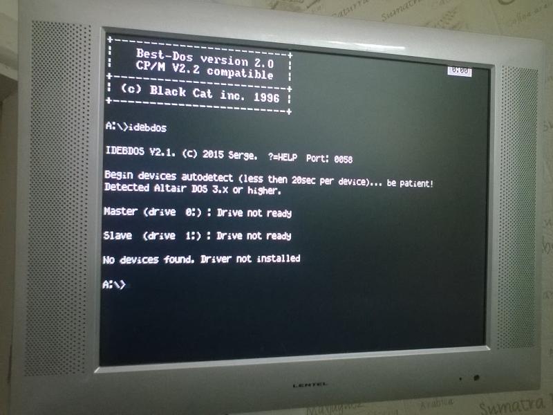 Какая схема IDE используется? "Port=0058" будет выводиться только для схемы IDE-RTC (порты 0056..005F). Для схемы на ВВ55 должно выводиться "Port=F600" (если в командной строчке не был указан другой адрес ВВ55, что позволительно). На гите есть обе версии бинарников, в т.ч. и в виде драйвера (но можно и скомпилировать самому: все есть - исходник, make). Там же пример CONFIG.SYS (см. как конфигуририровать драйвер в начальную загрузку), плюс я для кого-то старался-описывал еще тут.