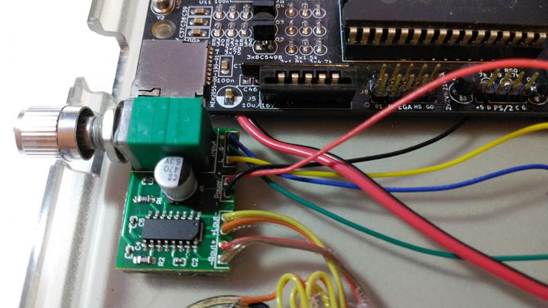 На модуль усилителя с внутреннего разьёма ZXBUS взяты земля, MixL и MixR, питание 5В берётся также с JP2. Если модуль выключен (потенциометр на нём с выключателем),