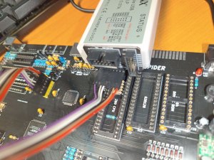 6) Подключаем комплектный переходник к JTAG Serial SPI на Platform Cable. В нижний 8-пиновый разъем один конец кабеля, в 6-пиновый разъем JTAG на плате другой конец. Внимательно дважды проверяем с какой стороны у нас питание VCC (красный провод):
