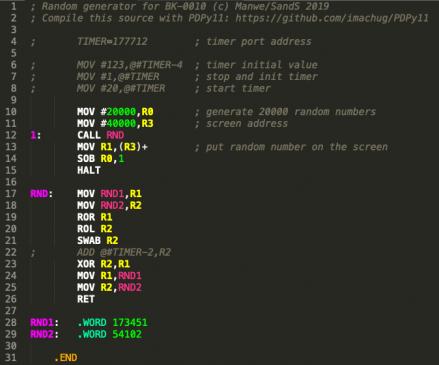 Ну и, понятное дело, если в вашей программе много свободных регистров, то надобность в ячейках памяти RND1 и RND2 отпадает, всё можно хранить в регистрах R1 и R2. Такая процедура будет работать раза в два быстрее. Или в три.Код:; Random generator for BK-0010 (c) Manwe/SandS 2019