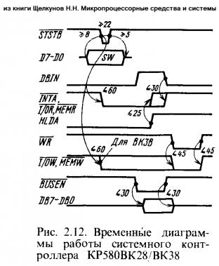 Отличие микросхемы КР580ВК28 от микросхемы КР580ВК38 состоит в формировании сигналов IOWR, MEMWR . Микросхема КР580ВК28 формирует эти сигналы относительно сигнала WR «За*пись», а микросхема КР580ВК38 - относительно сигнала STSTB «Строб состояния», что позволяет при применении в микропроцессор*ной системе микросхемы КР580ВК38 использовать ЗУ и УВВ с более широким диапазоном быстродействия.