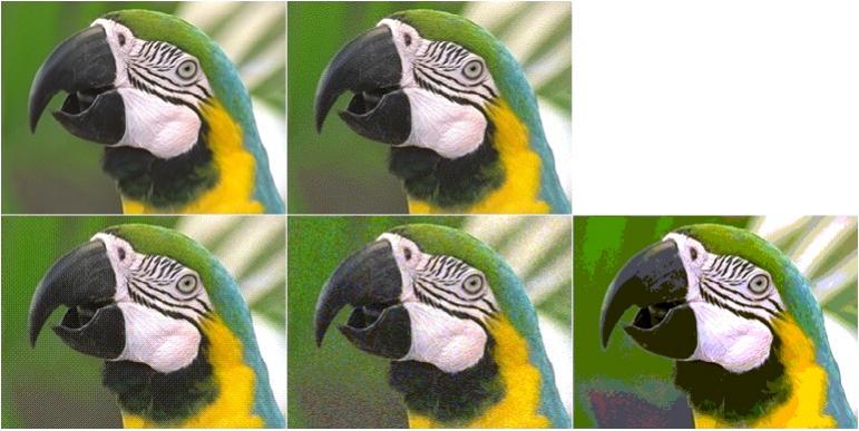 Для примера сделал из первой картинки, слева направо, сверху вниз: RGB888, далее RGB332 методами Флойда-Стейнберга, сеткой, случайный шум, ближайший сосед.