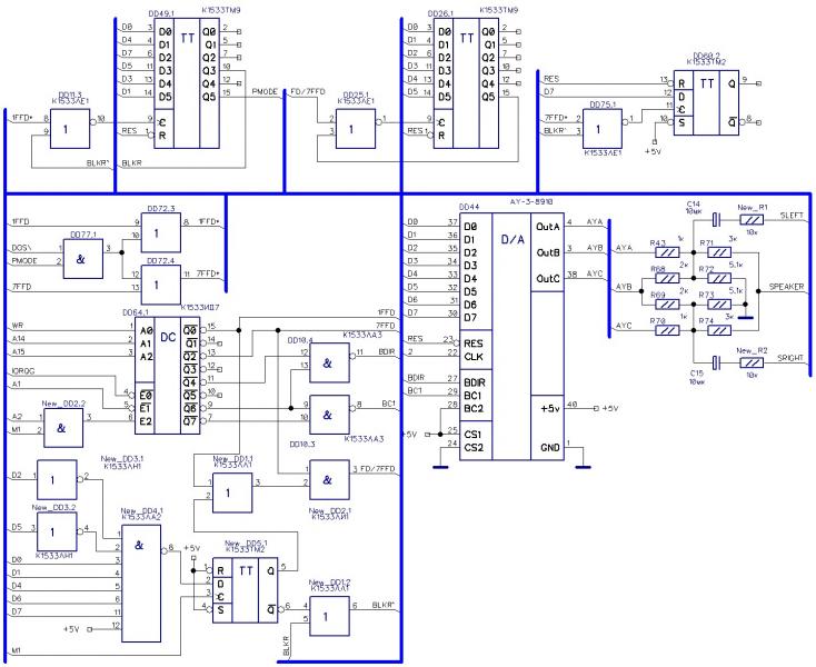 New_DD1.2, на котором активируется блокировка портов #1FFD и трёх триггеров 1533ТМ2, реализующих биты выборки верхней памяти, D5,D6,D7 порта #7FFD.