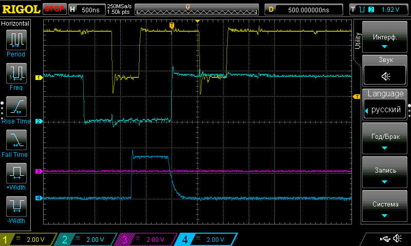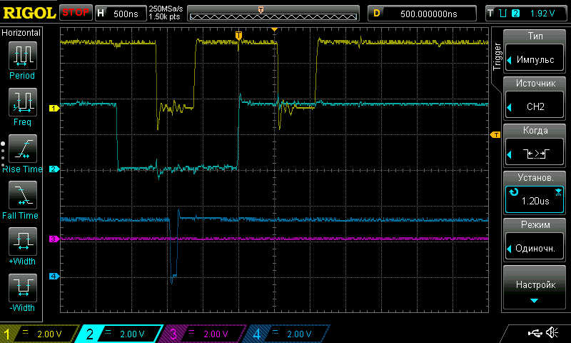 То есть, дело не в Микроше, а просто по какой-то причине не сохраняется 0 на ноге D7 дольше 100нс. Хотя по-хорошему, контроллер должен дождаться когда желтый и голубой сигнал перестанут быть одновременно 0, и с некоторой задержкой перестать удерживать 0 на ноге D7.