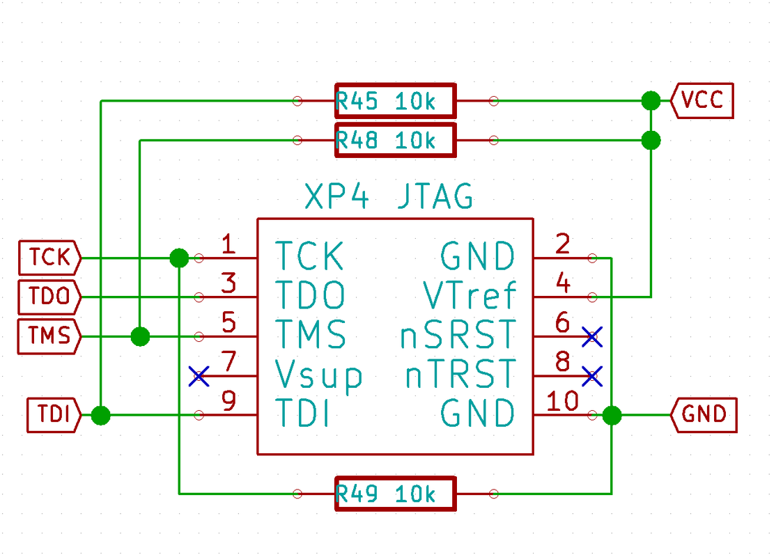 Подключил все ноги питания. Поставил блокировочные конденсаторы 0.1 мк. На JTAG подтягивающие резисторы 10К.