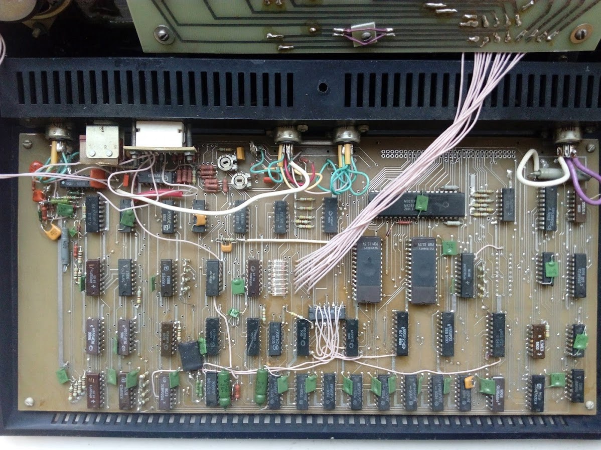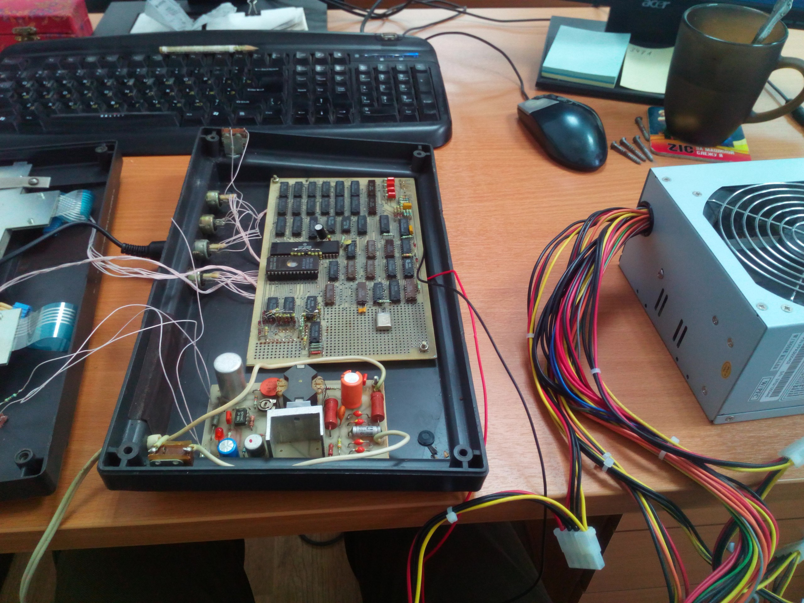 Доброго времени суток, уважаемые! Недавно мне подарили 24 годовалый клон я так понимаю Ленинграда 48. Но именно такого здесь я не встретил. Чтобы проверить нужно было подключить его к монитору, ибо к телевизору не вариант. Проштудировав здесь темы по данной задаче я заказал с али GBS8200. И вот наконец то требуемая железяжка пришла. Т.к. непонятно что за клон и отсутствие схемы, я разобрал и нашел выходы RGBS. Распаяв провода и подключив сие чудо, меня ждало разочарование - Speccy не завелся. На экране черно белые полосы(на фотках представлено) с мигающими в произвольном порядке знакоместами разных цветов. Первое что пришло в голову это проверить напряжение с встроенного БП. Оно оказалось 3,9 вольта. Я отключил встроенный БП и подпаяв провода, подключил "нормальный" ATXый БП. Но это не помогло, полосы остались но уже без мигающих знакомест. Далее еще полазав на этом форуме, рекомендовали в подобных случаев потрогать что греется на плате. В результате после включения питания через пару минут проц калится так что пальцем его невозможно держать. Ждать что с ним произойдет дальше я не стал, но думаю это не нормально. Так вот хотелось бы точно идентифицировать мой клон, найти схему хотя бы близкую к нему ну и найти и устранить неисправность и воскресить! Еще микросхема ПЗУ была не заклеена, может ли это быть причиной поломки в следствии "порчи" прошивки при попадании света на микросхему?