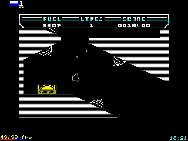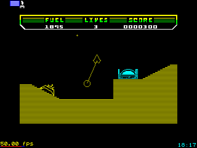 - сфера находится на пьедестале на поверхности планеты либо в глубине пещер. Включив силовое поле корабля (кнопка ВНИЗ) рядом со сферой, нужно установить тяговой луч, затем следует со включенным полем отлететь от пьедестала. Когда сфера оторвется от пьедестала, поле нужно выключить, так как оно потребляет уйму топлива. Дальше сфера будет болтаться сзади, а нередко всюду вокруг корабля, сильно мешая маневрам. На первой планете это несущественно, можно просто утащить сферу вверх, не обращая внимания на ее карусель. Отлетев от планеты на три-четыре экрана, вы автоматически отправитесь на базу. Если без сферы, то придется снова за ней вернуться. Если со сферой, получите награду и отправитесь дальше;