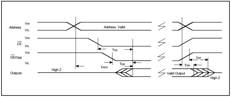 Процедура правильного чтения ,выставить адрес , перевести в 0 CE ,задержка ,перевести в 0 OE , прочитать данные и т.д.