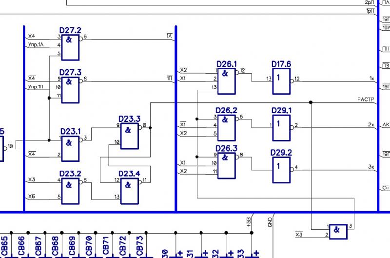 Похоже, что индикацию результата я поправил. Причина: за разрешение вывода результата отвечает триггер D23.3-4(вся нумерация в соответствии со схемой платы(не из книжки)), когда счетчики строки досчитывают до 1-й позиции, триггер меняет состоянии и начинается отображение цифр, но дело в том, что старший разряд и младший формируются по-разному и в схеме происходило наложение младшего разряда на старший. За отображения цифры младшего разряда отвечают сигналы 1x,2x,3x, сигнал РАСТР говорит о том, что сейчас разрешено отображение всего счета. В общем, сигнал РАСТР оставил как есть, в формирование сигналов 1x,2x,3x внес изменения - сигналы формируются совместно с инверсным X3 через И.