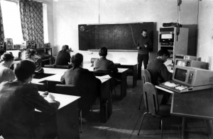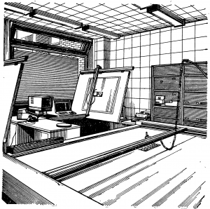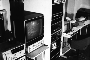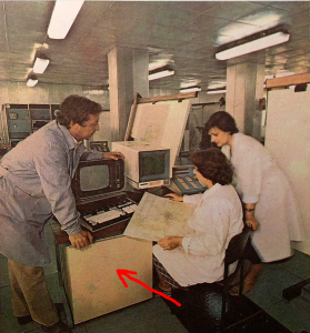 Здесь видимо чуть др. промежутки времени - на фото из учебника 1984 г. - похоже на топологический комплекс Кулон с СМ1420 ЭВМ, который начали поставлять года так с 1980-го ( с СМ-4 ), что по тем временам считалось верхом совершенства, т.к. до Кулона топологию делали скальпелем, вырезая из 2-слойной пленки верхний красный слой, оставляя только прозрачный низ, далее делали фотошаблоны обычным мокрым фото-процессом.