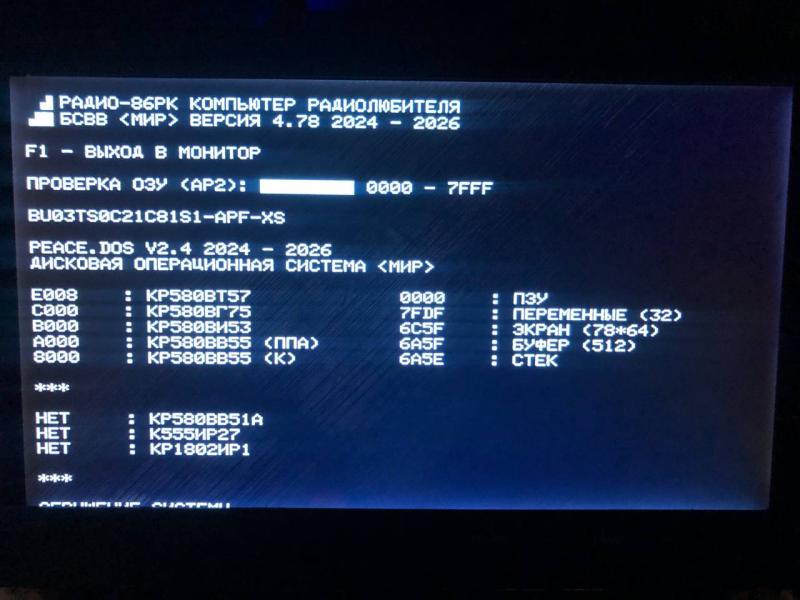 У машин на статике (не уверен, что у всех) ПЗУ после сброса стартует с адреса E000. Это значит, что можно ставить ПЗУ размером 8кб. Так у меня и получилось. Биос стартует с E000, настраивает все устройства, проверяет память. Потом можно выбрать загрузку с CF-карты FAT16 или через ППА, или вынырнуть в Монитор, который в 8кб ПЗУ сидит на старом адресе. Примерно так это всё выглядит: