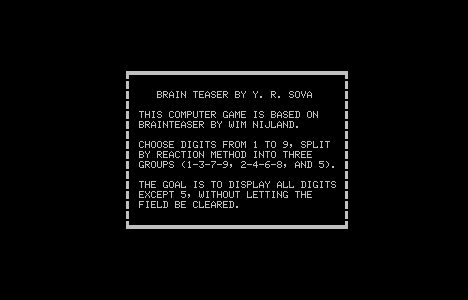 Эта компьютерная игра основана на «BrainTeaser» от Wim Nijland. Выбирайте доступные цифры от «1» до «9», разделяющиеся по методу реагирования на три группы («1-3-7-9», «2-4-6-8» и «5»). Цель — отобразить все цифры, кроме «5». Только следите, чтобы поле полностью не очистилось.
