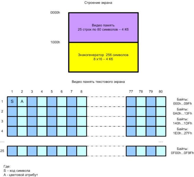 Сейчас уже точно не скажу, но у меня строился текстовый режим почти как в PC. Байт символа, затем байт атрибута. Но для этого я две микросхемы памяти объединил в общее адресное пространство. Тоесть видео работало в 16 битном режиме, а с процессором общался по 8 битной шине. Если цвет не нужен, то наверное можно и в 8 битном режиме. Погляди исходник, там поймешь как оно работает.