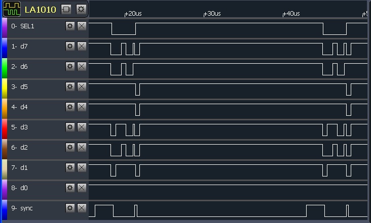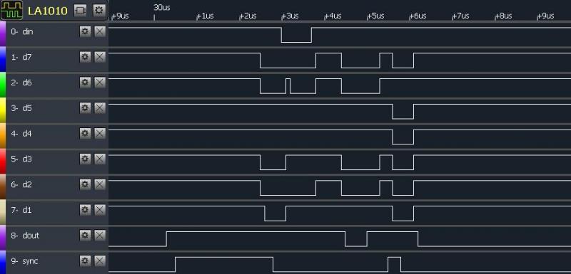 Вроде, 1 постоянный был, когда я триггером осцилла ловил... Но сейчас ЛА перепроверю. Меня тоже младший байт смущает немного - он от старта к старту по-разному выглядит, хотя четко прослеживаются 3-4 сценария поведения. Din Dout можно попробовать прицепить, но частота выборки упадет прилично... Хотя... Можно вместо SEL1 (он-то постоянно шевелится) и D0 (он все-равно в 1). Сейчас младший байт пересниму с Din и Dout.