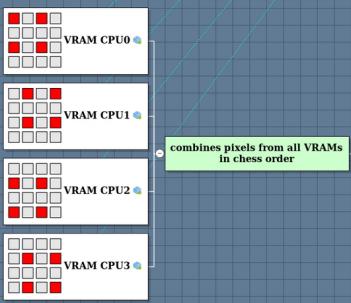 электронный луч выводится как всегда и везде, а то что ему цвет дает идет из видеопамяти и атрибутов разных областей