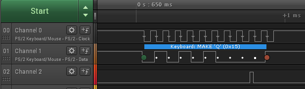 ...а я сразу удивился выбору синхронного режима, но скромно решил промолчать и подождать ;) Суммируя с получением INT из RxRDY получаем на выходе сканкод со стробом. Далее таблично получаем ASCII-код.