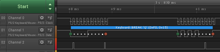 А вот для обратного - передачи инфы в клаву - кмк ВВ51 уже будет не хватать. Во-первых небольшая обвеска понадобится для тактовой на передачу, во вторых, чтобы переключить клаву в режим приёма, нужно подсадить CLOCK на 100мкс на массу, и затем делать передачу в клаву, http://ru.osdev.wikia.com/wiki/%D0%A...ost-to-dev.jpg. Боюсь, что ВВ51 на такой выкрутас не способен... Либо делать просадку внешней схемой, суммируя "проволочным ИЛИ" её выход с тактовым сигналом.