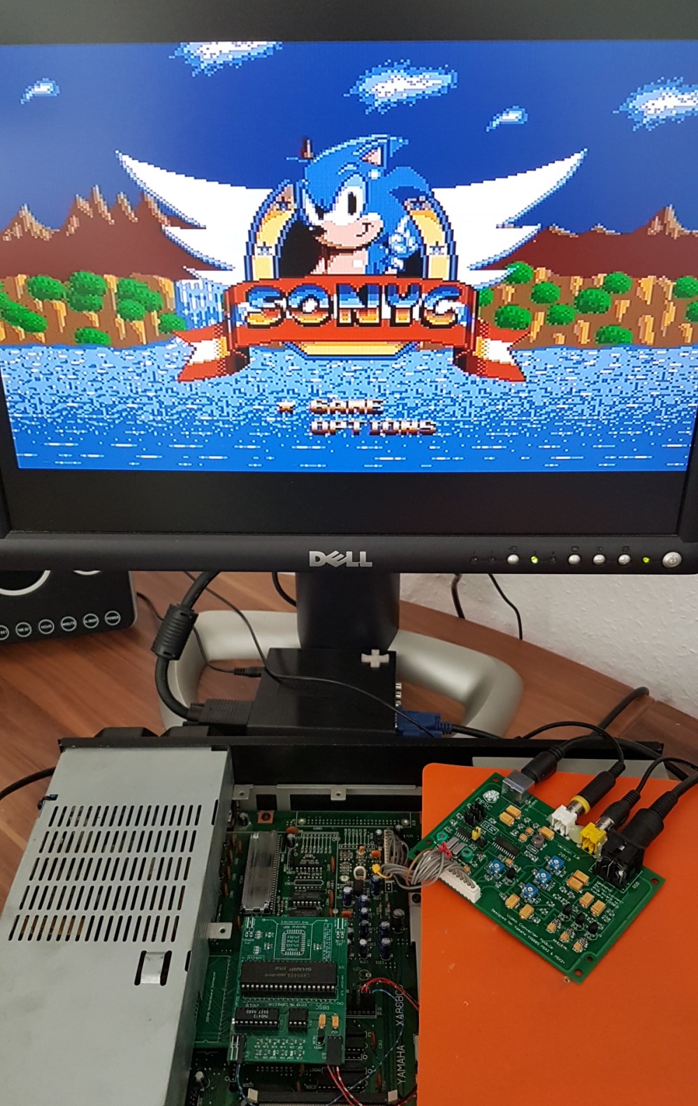 Наконец-то пришли другие чипы CXA1645. Как и ожидалось, первая партия от китайцев была фейк или брак. Теперь всё работает точно так же как и на подобной плате от 503й Ямахи. Соник запускается и монитор показывает картинку (с глючным чипом такого не было):
