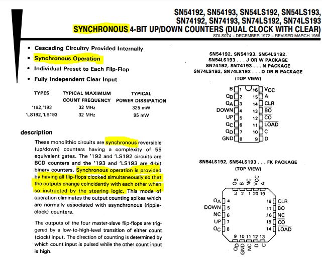 HardWareMan Честно, мне тяжело понять показанную вами схему 74LS193 и возможно вы правы, что данная схема не есть настоящий синхронный счетчик, хотя из показанной вами времменой диаграммы не очевидно поведение всех четырех выходов.