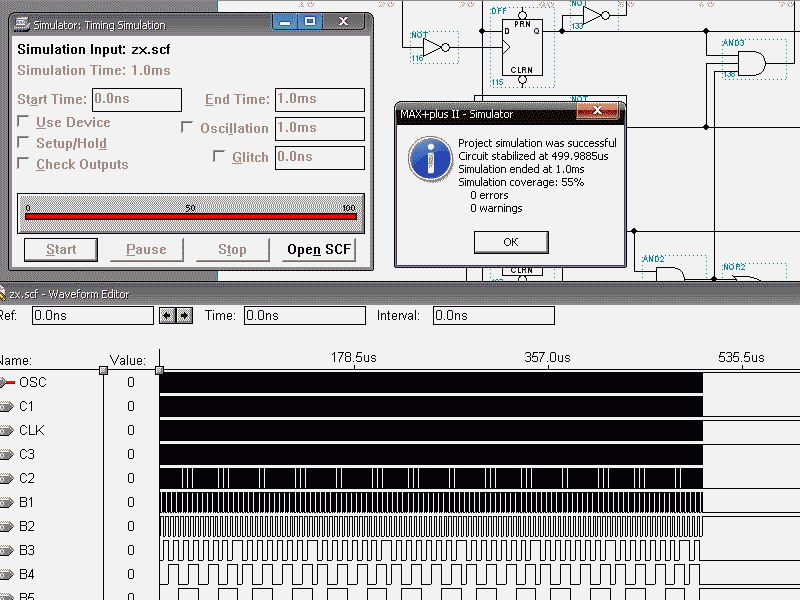 fan, попытался набросать проект в Max+Plus II. За основу взял узел генератора от "Пентагона-128". Вроде что-то получается. Но битый час бьюсь с одной проблемой - в симуляторе задано окончание симуляции 1 мс, однако через 500 мкс симуляция заканчивается и выдаётся вот это: