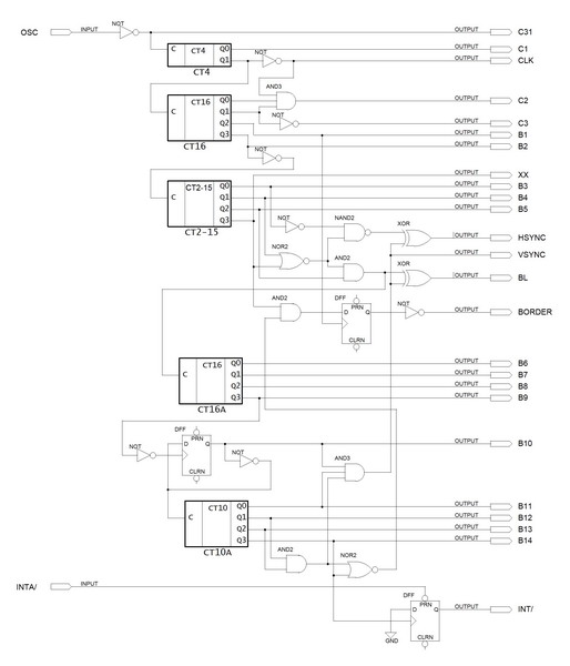 Наконец закончил схему генерации сигналов развёртки. Простое повторение схемы от "Пентагона-128" не проканало - "железная" схема была рассчитана на некоторую инертность сигналов, в результате чего асинхронность некоторых узлов прокатывала. Здесь же пришлось вылизывать, чтобы не было нежелательных "клыков", создающих ложные импульсы.
