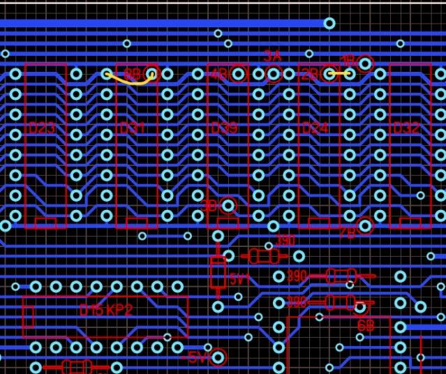 В наличии было несколько планарных 533лн1 в золоте. Грех было их не использовать, поэтому при разводке оставил место и под них и возможность установки в DIPe. На другой стороне платы есть запаиваемые пины-перемычки. С помощью них коммутируют соединения с дешифратором, при установке более емких ПЗУ и коммутация при установке разных микросхем ОЗУ. За счет сокращения места пришлось заменить разъем второго порта ВВ55 на СНП34-30. Традиционно, справа осталось место для макетирования.
