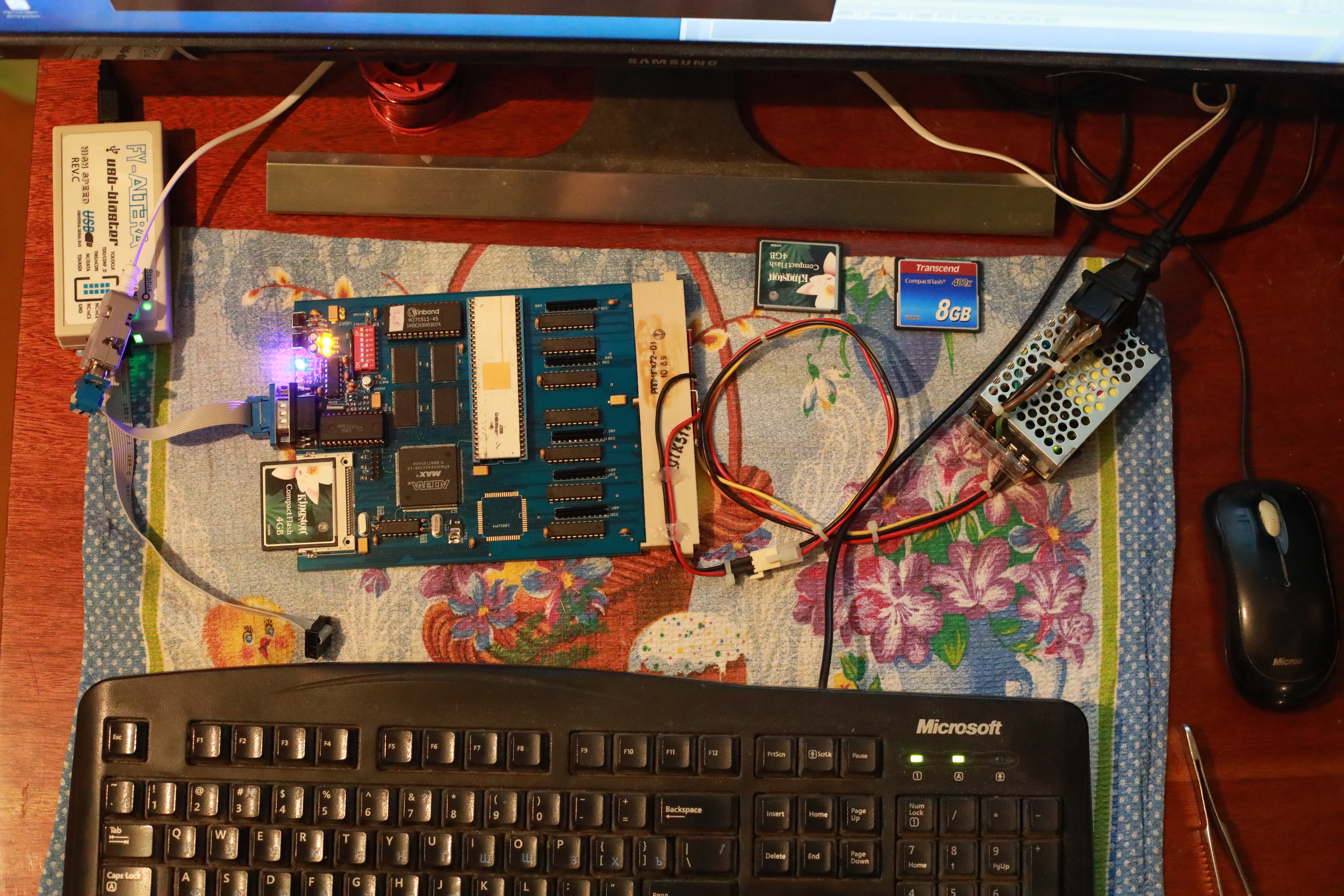 Немного демонстрации :) Пока плата не в корзине Квант-а - что то я протупил и забыл спросить назначение переключателей на плате. Она сделана с возможностью как работать в корзине ДВК-Квант-а, так и самостоятельно, так что просто так не сунешь.