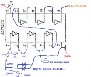 Тут же можно экспериментировать. Я бы делал так: подпаял бы провод на 11 ногу DD38 и во время звучания пилотона подключал бы его на выходы каждого модуля микросхемы (это 2я, 4я, 6я, 8я, 10я и 12я ноги), поочередно и смотрел бы где сигнал пройдет. Таким образом можно выявить какая часть микросхемы вышла из строя.