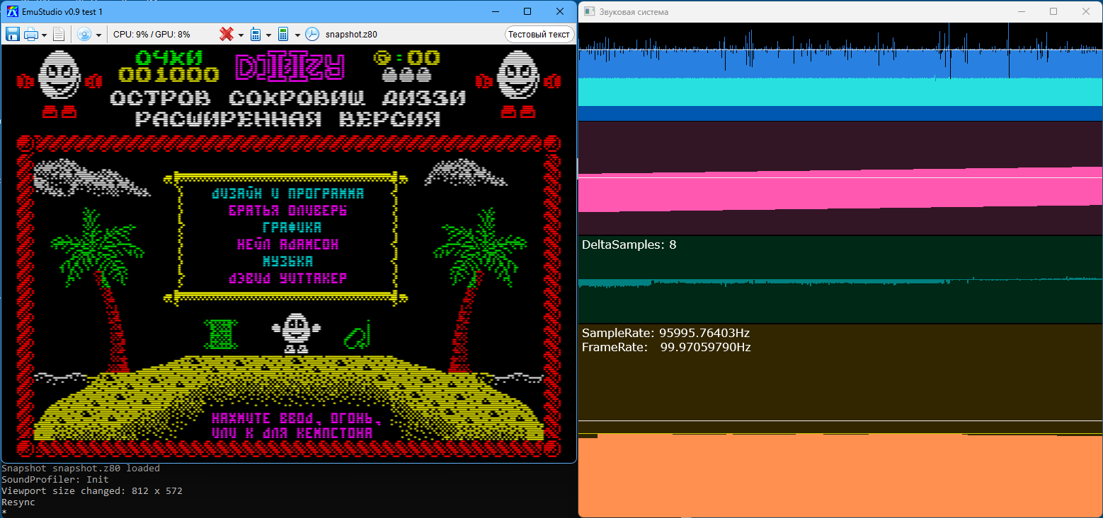 Самое сложное, что удалось решить - это точную синхронизацию видео и аудио. Как я уже писал многократно, основная проблема всех эмуляторов в том, что они синхронизируются только по аудио, а видео подгоняется в зависимости от эмулятора с той или иной степенью точности. Любой плавный скролл в игре или демке, даже если ваш монитор имеет развертку равную эмулируемой модели (например, 50Гц), либо кратную (100Гц, 150Гц), все равно будет или неприятно дергаться (не буду называть большинство популярных эмуляторов, грешащих этим), либо почти не дергаться, но раз в несколько десятков секунд, когда набегает погрешность биения частот аудио и видео, все равно будет несколько подергиваний (например, ZXMAK, чем он мне весьма нравился). При этом, НИ ОДНОГО эмулятора, который бы точно синхронизировался по видео и аудио я не встречал (может есть, обязательно укажите).