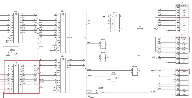 СНД0..СНД7 (CD0..CD7) "шина" байтов цвета, наверное. А сигнал СНД28 (SND28), это строб для нее (см. DD28 и DD29 sys001).