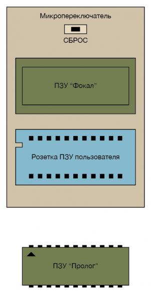 К БК-0010 (Фокал) ПЗУ «Пролог» подключается очень просто: устанавливается в розетку ПЗУ пользователя, расположенную в специальном отсеке под отодвигающейся крышкой (рис. 1). При этом важно не перепутать порядок ножек микросхемы. Ножка с номером 1 отмечена на микросхеме стрелкой, а клемма розетки с номером 1 отмечается вырезом на розетке.