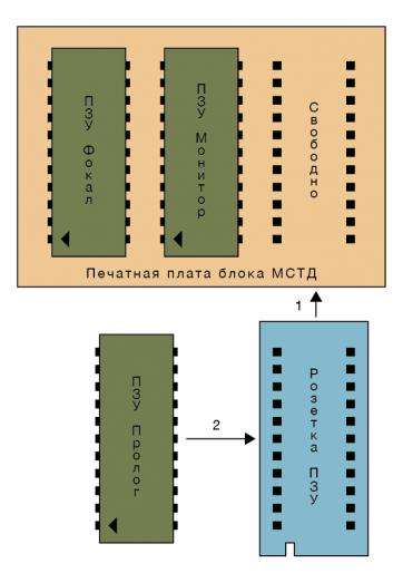 Несколько сложнее установить ПЗУ «Пролог» в БК-0010.01 (Бейсик). На месте розетки пользователя в этой машине находятся впаянные микросхемы ПЗУ «Бейсик»; крышка, закрывающая ПЗУ, заклеена. В данном случае ПЗУ «Пролог» устанавливается в блок МСТД в соответствии с рис. 2. На печатной плате блока есть свободное место, на которое припаивается розетка ПЗУ типа РС-24, а в нее вставляется микросхема ПЗУ (последняя не допускает пайки). Розетки РС-24 продаются в магазинах «Радиолюбитель», «Юный техник» и т. п. Впаивать розетку необходимо с учетом номеров клемм, так же как впаяны другие микросхемы на печатной плате МСТД. На рис. 2 цифрами 1 и 2 показана последовательность работ. Для работы блок МСТД подключается к разъему МПИ.