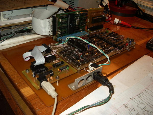 2) Потом нахлынула ностальгия, из загашника досталась плата, которую пытался реанимировать еще во времена рабочего п.1 :) После неуспешной попытки была распаян на м/с, а сам планировался под контроллер CDROM из РадиоХобби на z80. Не срослось, так плата и валялась до того как нашло вдохновение и было рождено то что сейчас в подписи :) Правда тут еще обычная ПЗУ, в новой ревизии уже стоит Atmel 29c010A :v2_thumb: