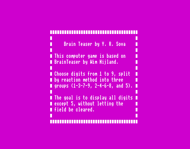 Эта компьютерная игра основана на «BrainTeaser» от Wim Nijland. Выбирайте доступные цифры от «1» до «9», разделяющиеся по методу реагирования на три группы («1-3-7-9», «2-4-6-8» и «5»). Цель — отобразить все цифры, кроме «5». Только следите, чтобы поле полностью не очистилось.