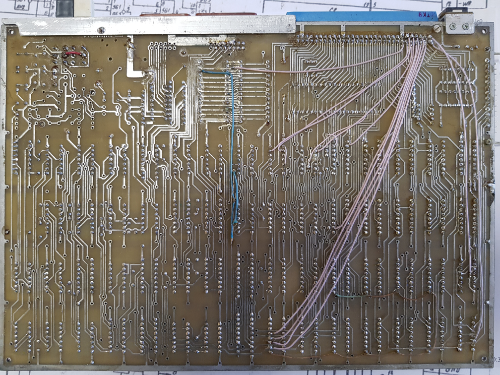 То есть тупо бери лобзик, отпиливай и будет 16к машина. Колхоз на монтажках там это джойстик и кажется линия задержки на CAS/RAS по 16к банке в виде цепочки инверторов чтоб с RC цепочкой не казниться. Я не удивлюсь что будучи отпиленной эта плата по высоте должна тютелька в тютельку входить в какую-то из советских клавиатур. Ибо будучи не отпиленой эта плата оказалась крайне странного габарита, которая не лезла разумно никуда вообще.