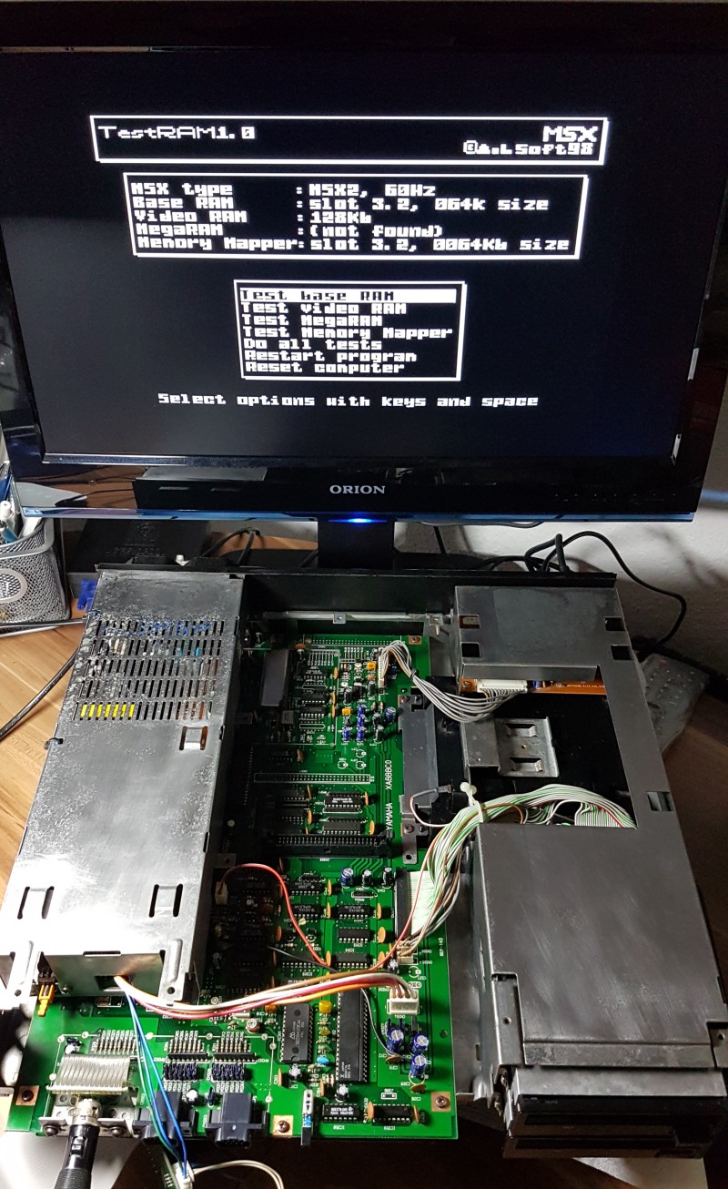 Я заменил видеоплату на другую такую же, оставшуюся от апгрейда в MSX2+ моей коллекционной Ямахи. При включении питания появилось изображение и комп проинициализировал оба дисковода, а потом попытался загрузиться с диска А. Подсунул ему системную дискету - комп загрузился в ДОС. Запустил TESTRAM - он показал только 64кб ОЗУ вместо 128кб. Скорее всего одна или пара микросхем сдохли. TESTMAP показал ошибки в маппере (такое бывает, когда комп не подключил битое ОЗУ, а маппер пробует с ним работать). Запустил пару игр - графика работает. Тест видеопамяти прошёл успешно.