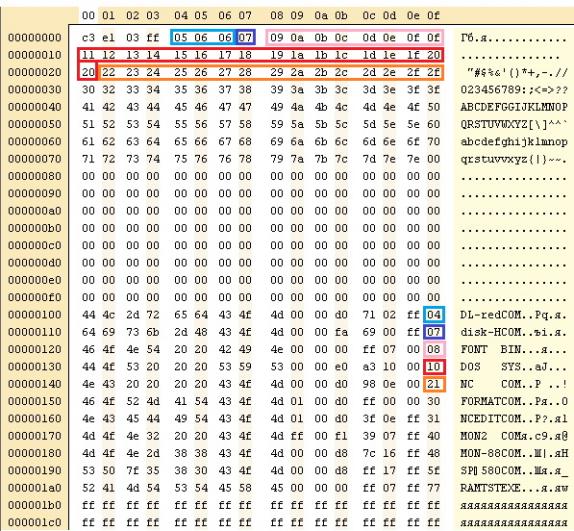 А вот обращение к 04h...fah - это работа с конкретным кластером. Я сделал так. Опрашиваю весь каталог из области fc00h...fcffh и по данным каждого дескриптора файла я вычисляю начальный и конечный кластеры занимаемые каждым файлом. Если этому диапазону принадлежит запрашиваемый кластер, то я считываю в буфер запрашиваемую область. Т.к. в MX-DOS можно считывать только один сектор (1/10 часть дорожки = 1024 байт), то необходим выбор какую 1/4 часть нам использовать. Номер 1-го сектора/дорожки мы берём из дескриптора соответствующего файла дискеты.