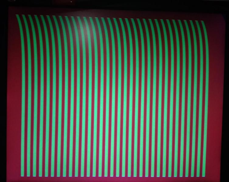 И, собственно, эту схему я уже собрал и немного протестировал (кроме SRAM), но не с Вектором, а автономно, с ардуинами и проводками. Работает, вроде, но есть одна проблемка: часто изображение заворачивается вверху экрана, возможно от того, что телевизор при некоторых цветах воспринимает первые строчные синхроимпульсы, как выравнивающие и смещает на полстроки начало изображения: