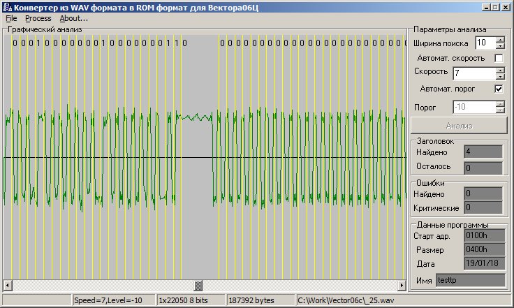 В качестве выхода выбран порт D3 на ардуино, к нему можно подключить для теста пьезоэлемент (второй вывод на GND), либо подключить непосредственно ко входу Вектора через конденсатор. Я пробовал его подключать напрямую ко входу звуковой карты ПК и записать сигнал в WAV-файл (пример: Вложение 64142), полученный файл без ошибок распознаётся программой wav2rom на скорости 6-8. На реальном железе ещё пока не протестил...