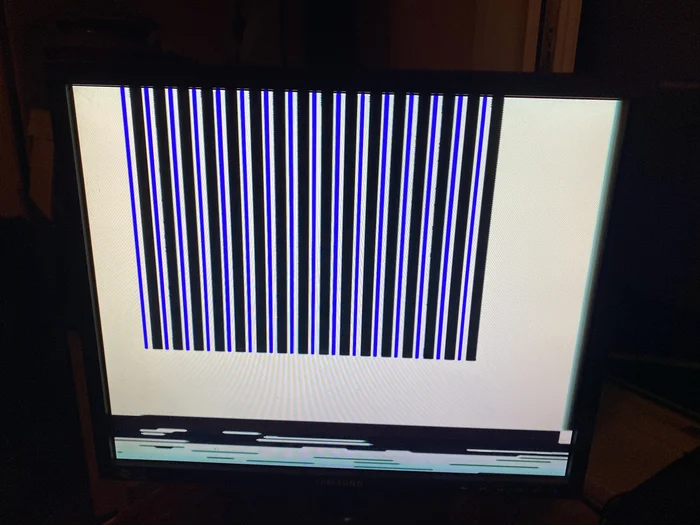 Надо бы скрин другого теста, когда построчно заполняется экран, смотреть, что пропускает. Но судя по буквам "Ш" и "Д" - косяк где-то в 6 или 7 бите. Я бы попробовал по одной м\с памяти вытаскивать, запускать тест, пока не совпадет с этой же картинкой :)